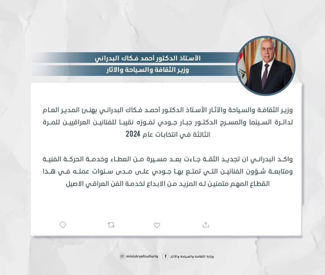 تهنئة من وزير الثقافة والسياحة والآثار أ . د أحمد فكاك البدراني لنقيب الفنانين العراقيين .. المقالة السابقة نقابة الفنانين العراقيين تثمن دور اللجنة المنظمة لإنتخابات نقابة الفنانين العراقيين ٢٠٢٤#بغداد المقالة التالية
