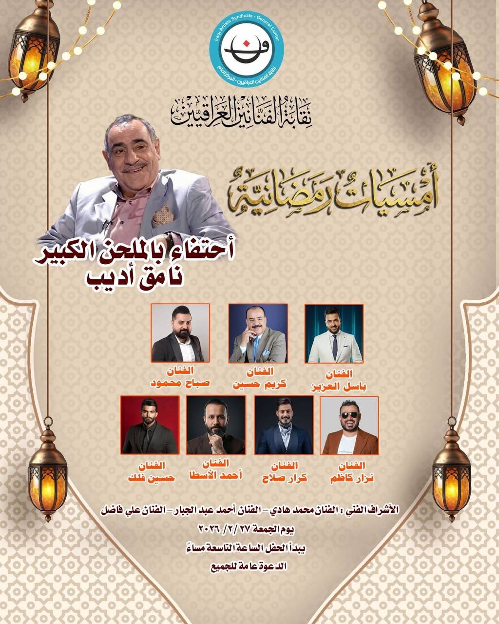 يبدأ الحفل الساعة ٩ مساءً على حدائق نقابة الفنانين العراقيين مقر النقابة شارع الرشيد مقابل شارع الخيام