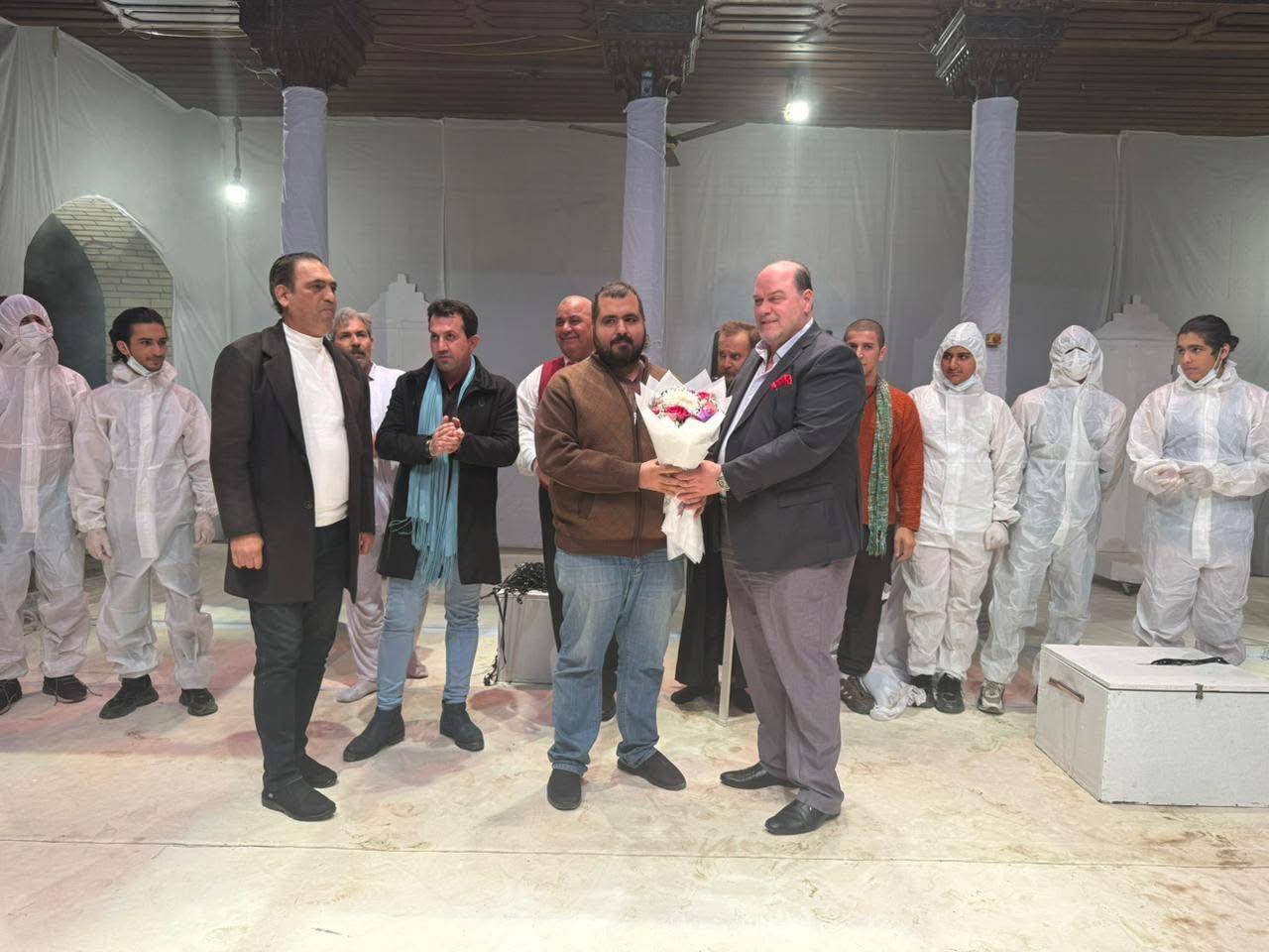 وقدم السيد النقيب خلال زيارته هذه التهنئة لصناع العرض ومبدعيه وباقة من الزهور ايمانا بعطائهم وابداعهم.